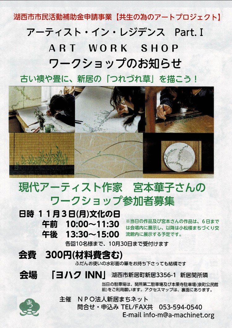 ※ 宮本華子 氏は、2023年秋から4回目の来訪で、今回は10月31日から11月6日までの滞在です。また、今回の滞在及びワークショップは、湖西市市民活動補助金事業【共生の為のアートプロジェクト】です。