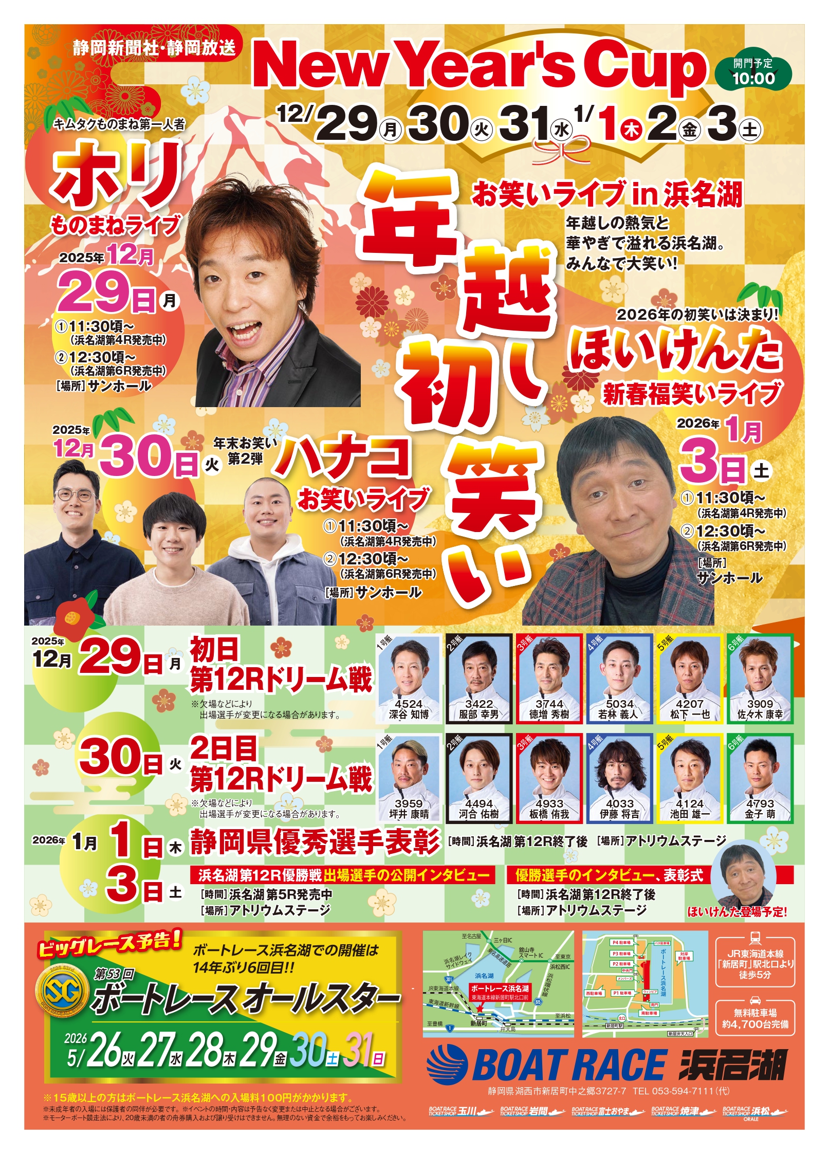 お知らせ 2025.12.16 ボートレース浜名湖でNew Year’s Cup開催 12月29日(月)から1月3日(土)まで年末年始恒例のNew Year’s Cupを開催します お笑いライブin浜名湖として 12月29日にホリ、30日にハナコ、1月3日にほいけんたによるものまねライブ、お笑いライブをサンホールで行います その他イベント盛りだくさんです ぜひボートレース浜名湖足を運んでみてください 詳しくはこちら