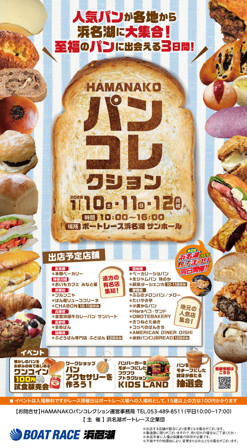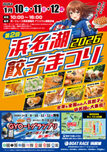 湖西市の「ボートレース浜名湖」では、1月10日(土)~12日(月)の3日間、全国の人気パンが大集合する「HAMANAKOパンコレクション」と人気餃子が勢ぞろいする「浜名湖餃子まつり」が同時開催されます。