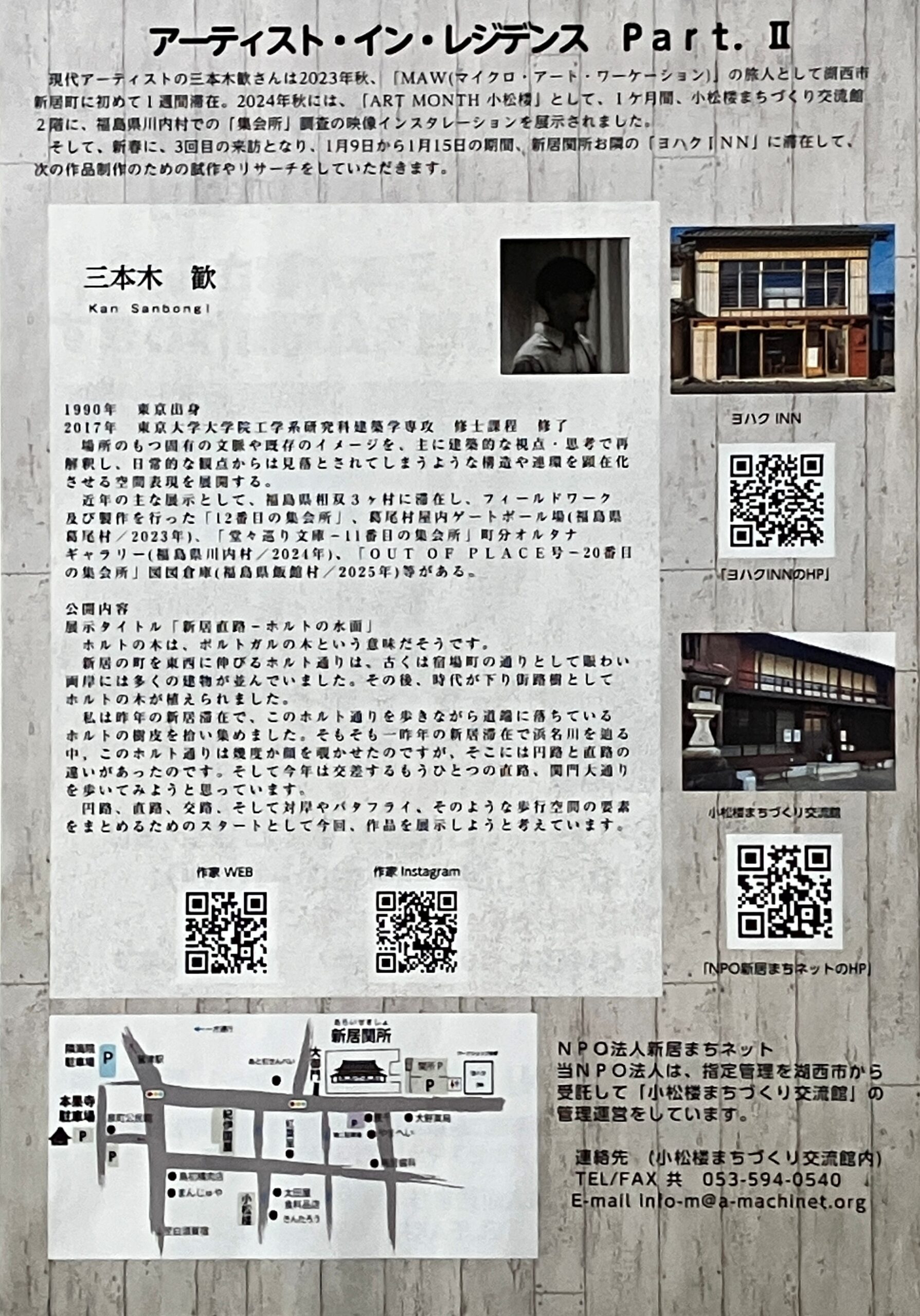 ※ 三本木歓さんは2023年秋、「MAW(マイクロ・アート・ワーケーション)」の旅人として湖西市新居町に初めて1週間滞在。2024年秋には、「ART MONTH 小松楼」として1カ月間、小松楼まちづくり交流館で、福島県川内村での「集会所」調査の映像インスタレーションを展示されました。