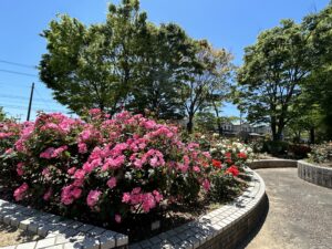 中根金作 氏が手がけた公園で、図書館から望む池泉式の日本庭園があるほか、桜並木や落葉樹の散歩道、芝生広場、バラ園などがあります。近くにはショッピングセンターやカフェもあり、散策にも最適です。(4月=さくら、5月=バラ)