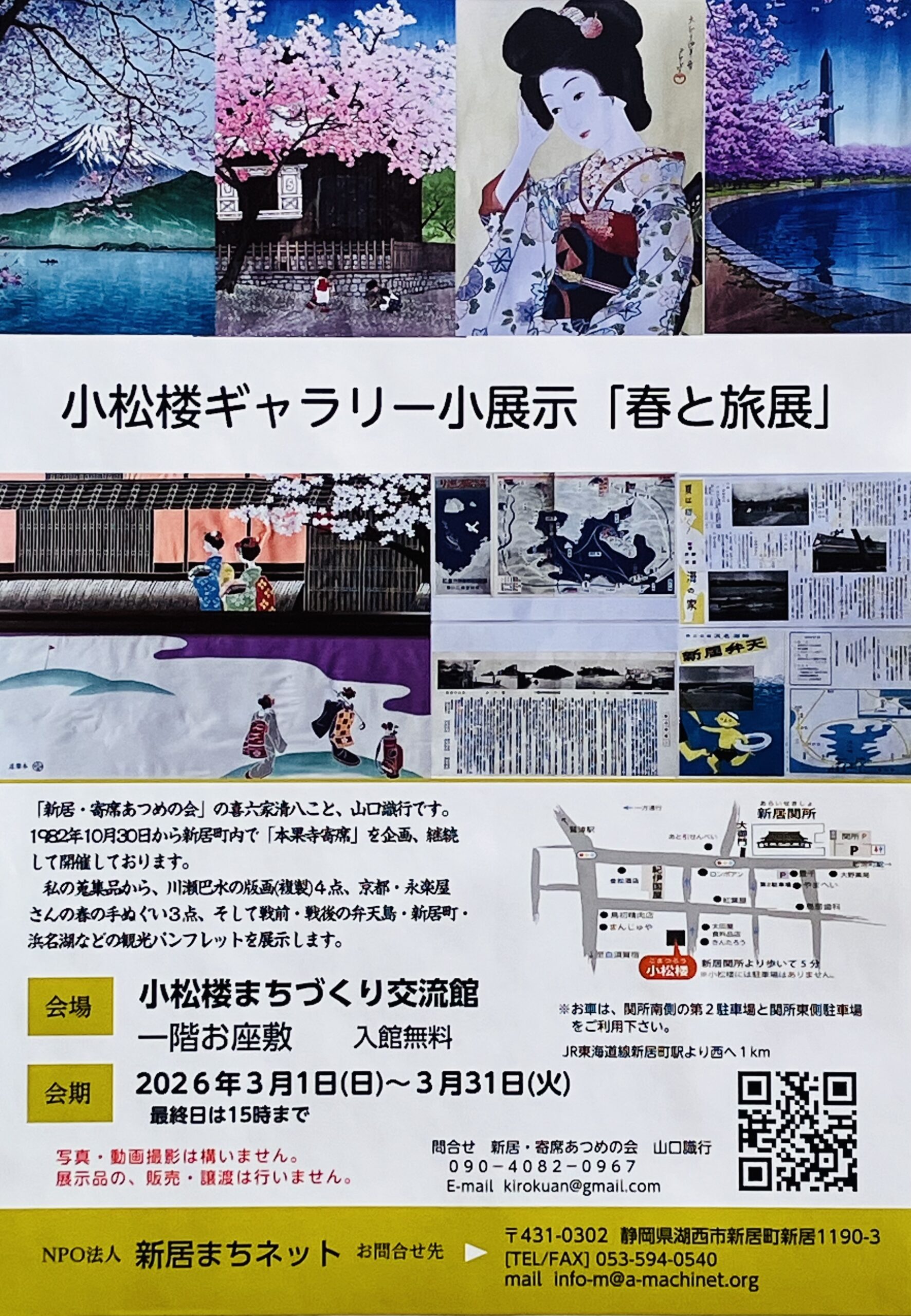 湖西市新居町の小松楼まちづくり交流館(国登録有形文化財 旧芸者置屋)では、3月1日(日)から3月31日(火)まで、「春と旅展」と題してギャラリーの小展示を開催します。