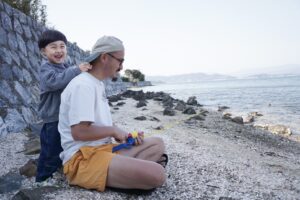 画題:父から子へ、釣りの英才教育