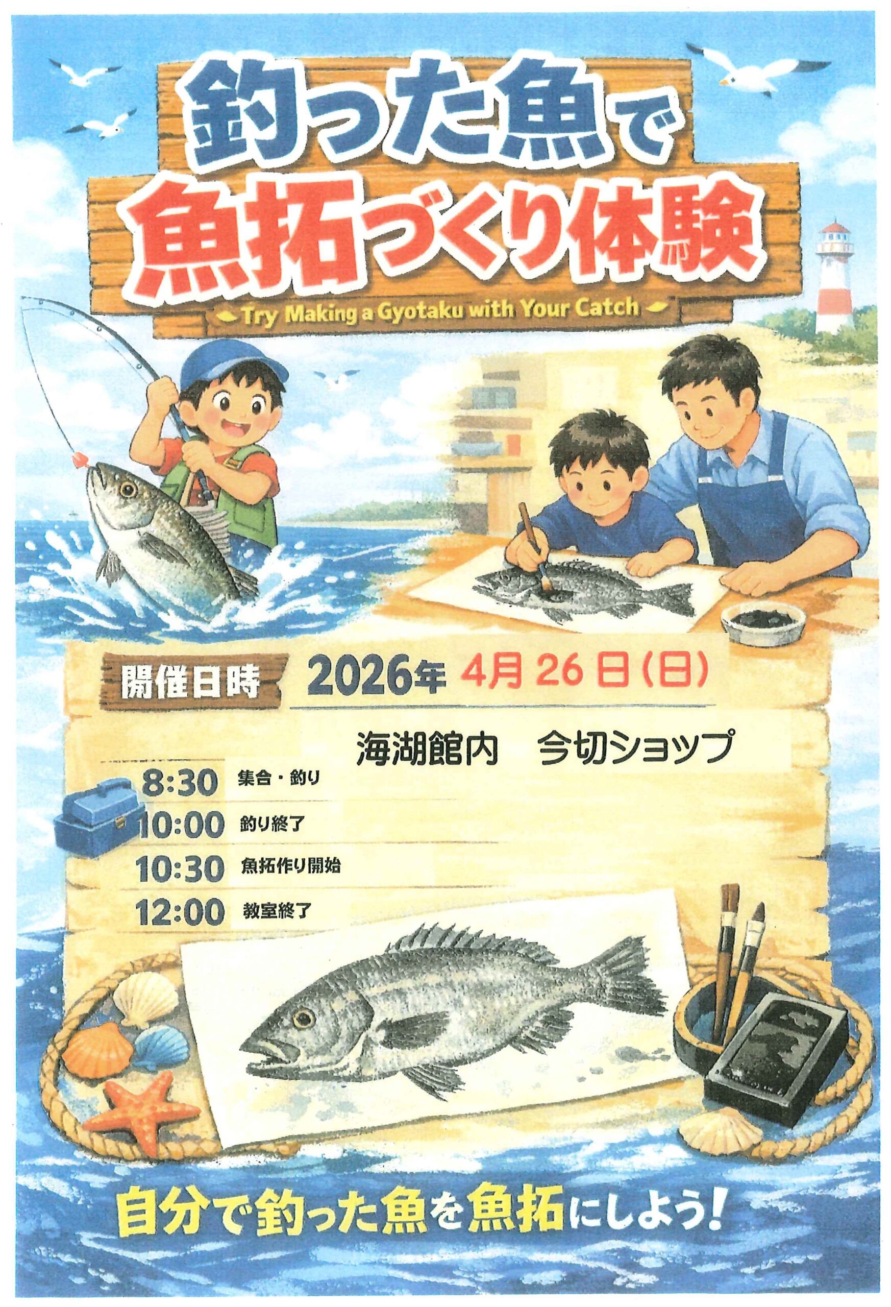 4月26日(日)、湖西市の新居弁天海釣公園では、自分で釣った魚を魚拓にする体験教室が行われます。