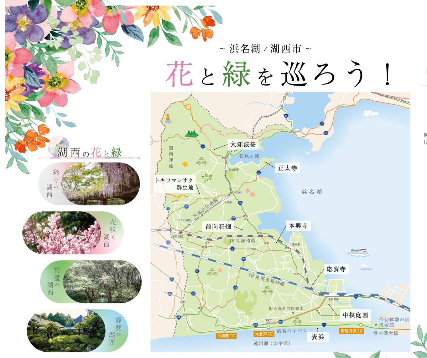 気候が温暖な浜名湖周辺や湖西市には、多くの花や緑の名所があります。湖西市内では、桜の名所と名庭園の鷲津地区「本興寺」、世界的造園家が手掛けた庭園でサツキやフジなどが見られる新居町地区 の「中根金作庭園」、ミヤマツツジと桜の入出地区「正太寺」、神座地区では全国でも珍しい「トキワマンサク」の群生地、また「ハマエンドウ」「ハマヒルガオ」の遠州灘海岸などが楽しめます。